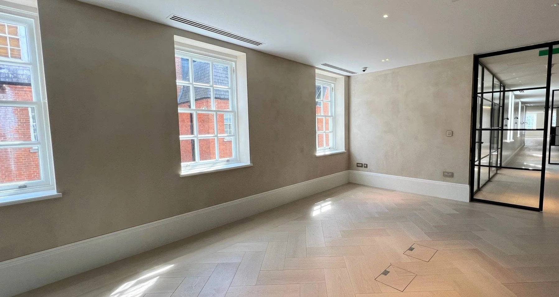 Modern, empty room with large windows, light-colored wooden flooring, and a glass partition with black metal framing.